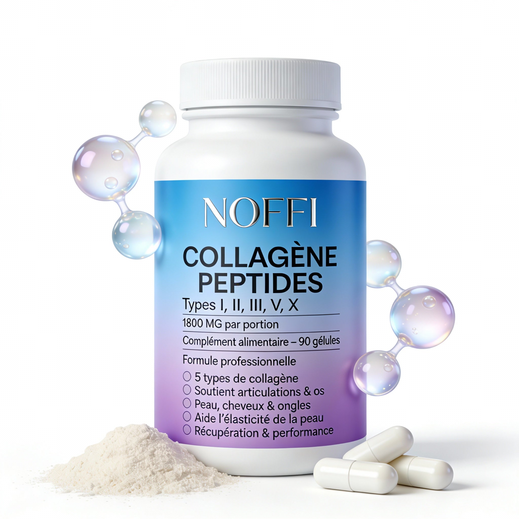 NOFFI Collagen Peptides combine 5 types de collagène hydrolysé (I, II, III, V, X) pour soutenir la fermeté, l’élasticité et la vitalité générale du corps.