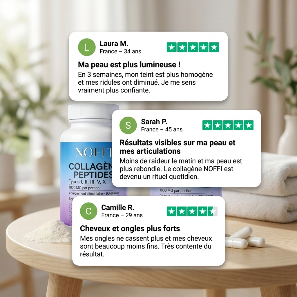 Données collectées auprès de 1 247 clients ayant utilisé NOFFI Collagen Peptides pendant au moins 30 jours. Adultes âgés de 25 à 60 ans. Collecte 2024. Les expériences rapportées peuvent varier.
